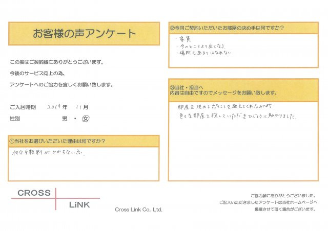 福岡・博多の賃貸を仲介手数料無料でご紹介|クロスリンク 博多店 > お客様の声一覧 > S様(2019年10月ご入居)