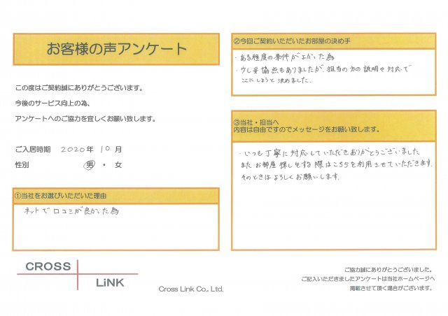 福岡・博多の賃貸を仲介手数料無料でご紹介|クロスリンク 博多店 > お客様の声一覧 > H様(2020年10月ご入居)