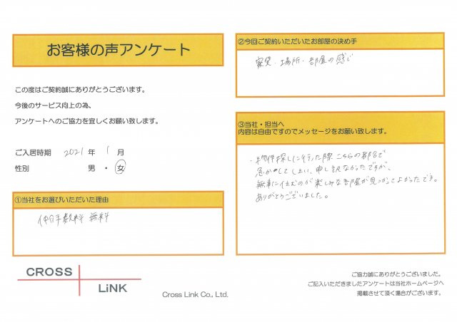 福岡・博多の賃貸を仲介手数料無料でご紹介|クロスリンク 博多店 > お客様の声一覧 > O様(2021年1月ご入居)