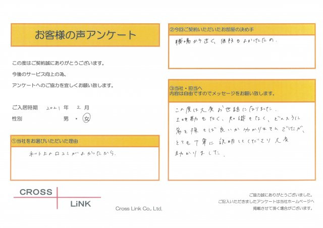 福岡・博多の賃貸を仲介手数料無料でご紹介|クロスリンク 博多店 > お客様の声一覧 > M様(2021年2月ご入居)