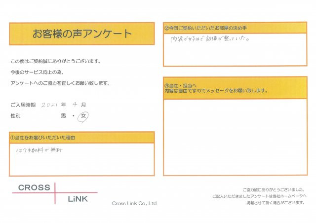 福岡・博多の賃貸を仲介手数料無料でご紹介|クロスリンク 博多店 > お客様の声一覧 > S様(2021年4月ご入居)