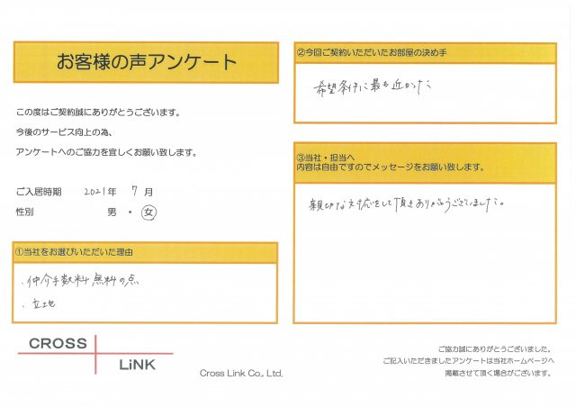 福岡・博多の賃貸を仲介手数料無料でご紹介|クロスリンク 博多店 > お客様の声一覧 > S様(2021年7月ご入居)