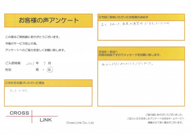 福岡・博多の賃貸を仲介手数料無料でご紹介|クロスリンク 博多店 > お客様の声一覧 > S様(2021年7月ご入居)