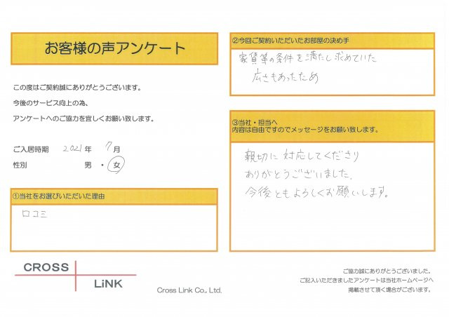 福岡・博多の賃貸を仲介手数料無料でご紹介|クロスリンク 博多店 > お客様の声一覧 > K様(2021年7月ご入居)