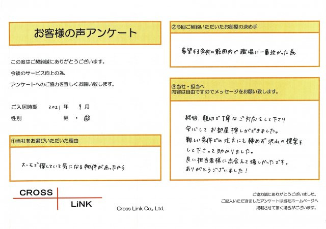 福岡・博多の賃貸を仲介手数料無料でご紹介|クロスリンク 博多店 > お客様の声一覧 > G様(2021年9月ご入居)