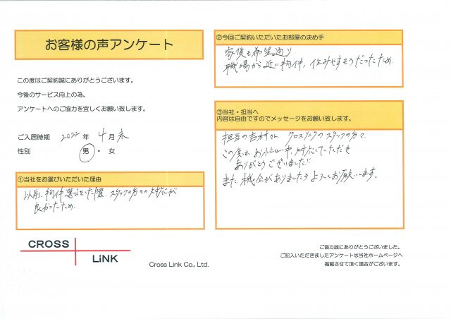 福岡・博多の賃貸を仲介手数料無料でご紹介|クロスリンク 博多店 > お客様の声一覧 > S様(2022年4月ご入居)