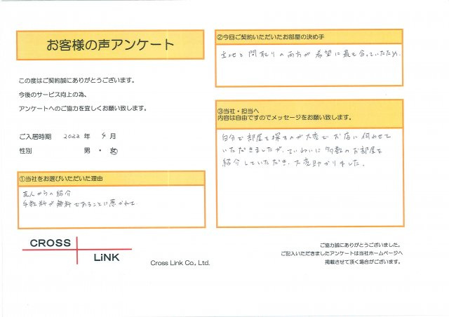 福岡・博多の賃貸を仲介手数料無料でご紹介|クロスリンク 博多店 > お客様の声一覧 > S様(2022年4月ご入居)