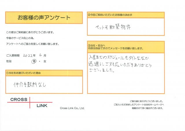 福岡・博多の賃貸を仲介手数料無料でご紹介|クロスリンク 博多店 > お客様の声一覧 > U様(2022年6月ご入居)