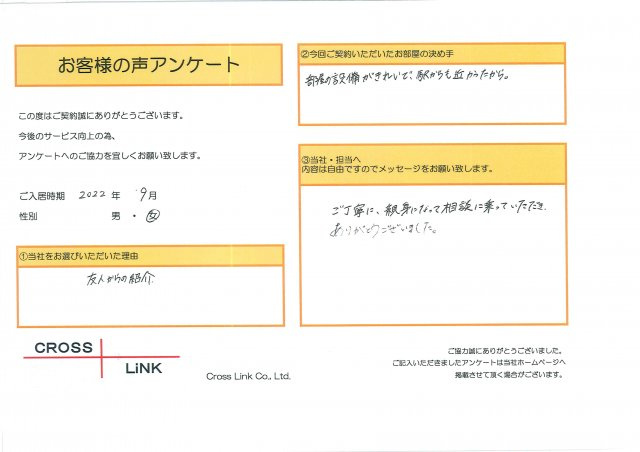 福岡・博多の賃貸を仲介手数料無料でご紹介|クロスリンク 博多店 > お客様の声一覧 > S様(2022年9月ご入居)