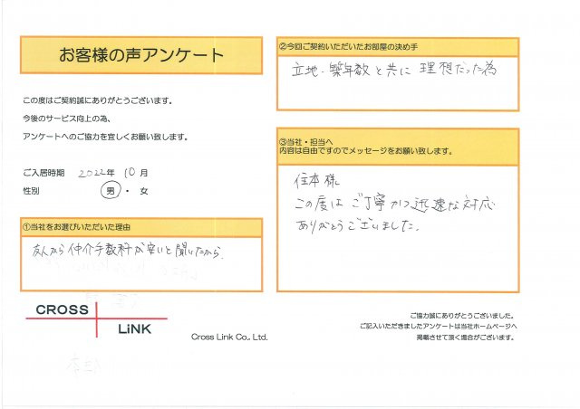 福岡・博多の賃貸を仲介手数料無料でご紹介|クロスリンク 博多店 > お客様の声一覧 > H様(2022年10月ご入居)