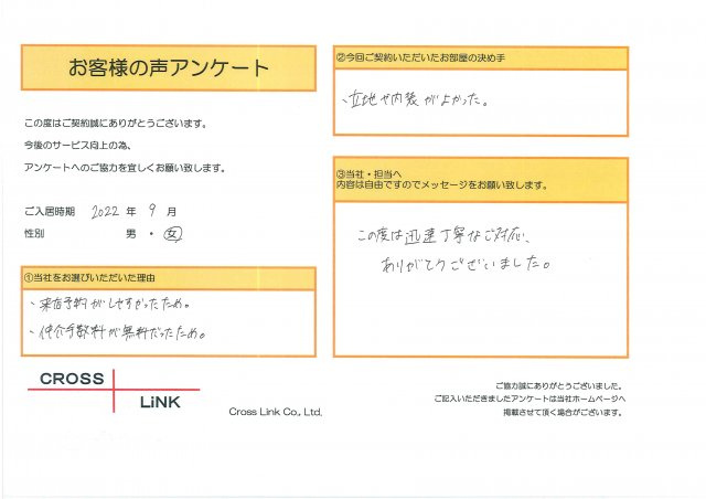 福岡・博多の賃貸を仲介手数料無料でご紹介|クロスリンク 博多店 > お客様の声一覧 > S様(2022年10月ご入居)