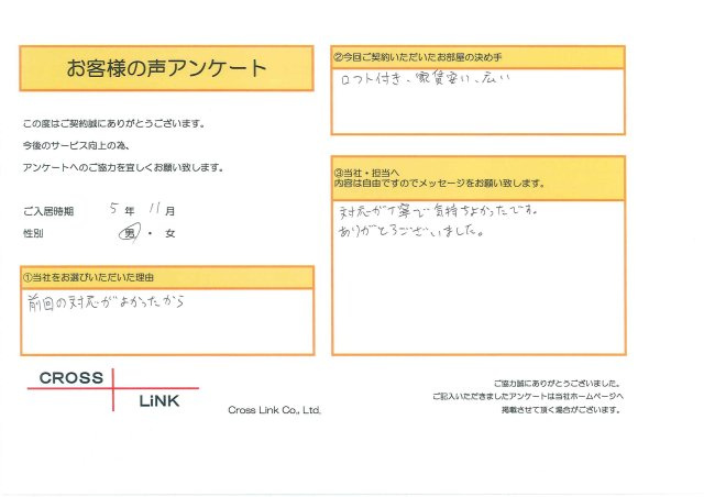 福岡・博多の賃貸を仲介手数料無料でご紹介|クロスリンク 博多店 > お客様の声一覧 > H様(2023年11月ご入居)