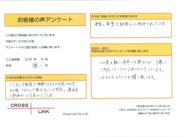 - 1つ目の不動産で納得いくものが見つからず、その後、クロスリンク様をネットで拝見し、雰囲気と評価がとても良かったため