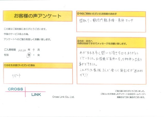 福岡・博多の賃貸を仲介手数料無料でご紹介|クロスリンク 博多店 > お客様の声一覧 > E様(2024年4月ご入居)