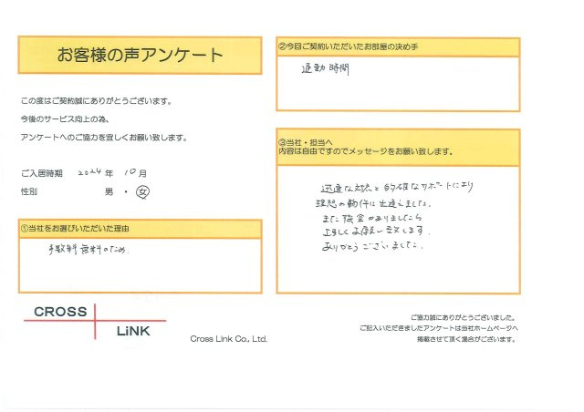 福岡・博多の賃貸を仲介手数料無料でご紹介|クロスリンク 博多店 > お客様の声一覧 > T様(2024年10月ご入居)